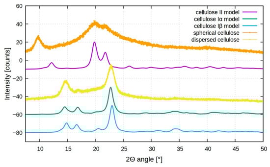 Figure 5 shows the XRD diffractograms of the different BCs. In the XRD spectra, the standard model of cellulose II, Iα, and Iβ are also reported. The diffraction pattern for dispersed sheet-like cellulose (yellow plot) shows three distinct peaks at 2θ = 14.6°, 16.6°, and 22.6°, in agreement with cellulose I structure, as also reported for cellulose produced by K. xylinus [35]. These peaks are assigned to the (1 0 0), (0 1 0), and (1 1 0) planes of cellulose Iα or the (1 1 0), (1 1 0), and (2 0 0) planes of cellulose Iβ [36,37]. Usually, cellulose produced by microorganisms is Iα, but distinguishing between the two allomorphs based solely on XRD peak positions is challenging due to their close proximity.