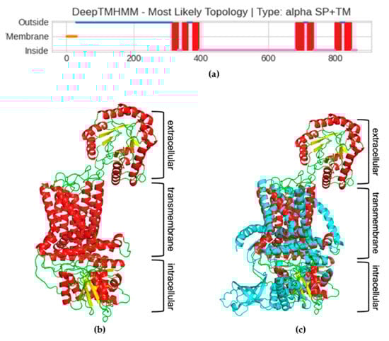 Given the constraints on residue length for the protein 3D modelling capabilities of this tool, the Pseudomonas sp. ef1 pBCSA amino acid sequence was segmented into three distinct overlapping sections based on transmembrane region predictions. These segments are defined as residues 1–350, 300–490, and 420–860, corresponding respectively to the extracellular domain, the initial three transmembrane helices, and the intracellular domain linked to the final four transmembrane helices. The final 3D model is reported in Figure 6b: the modelling confirmed the presence of the additional extracellular domain, not usually present in most of the BCS subunit A. The presence of this additional domain is even more evident in the superposition of the model with cellulose synthase A subunit of Cereibacter sphaeroides [43], which has been used as model template (5EJZ(MMDB) in iCn3D), reported in Figure 6c.