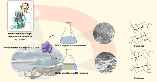 Biondini, M.C.; Di Sessa, M.; Vassallo, A.; Chiappori, F.; Zannotti, M.; Mancini, A.; Giovannetti, R.; Pucciarelli, S. Cellulose and Cellulose Synthase in a Marine Pseudomonas Strain from Antarctica: Characterization, Adaptive Implications, and Biotechnological Potential. Mar. Drugs 2025, 23, 410. https://doi.org/10.3390/md23100410