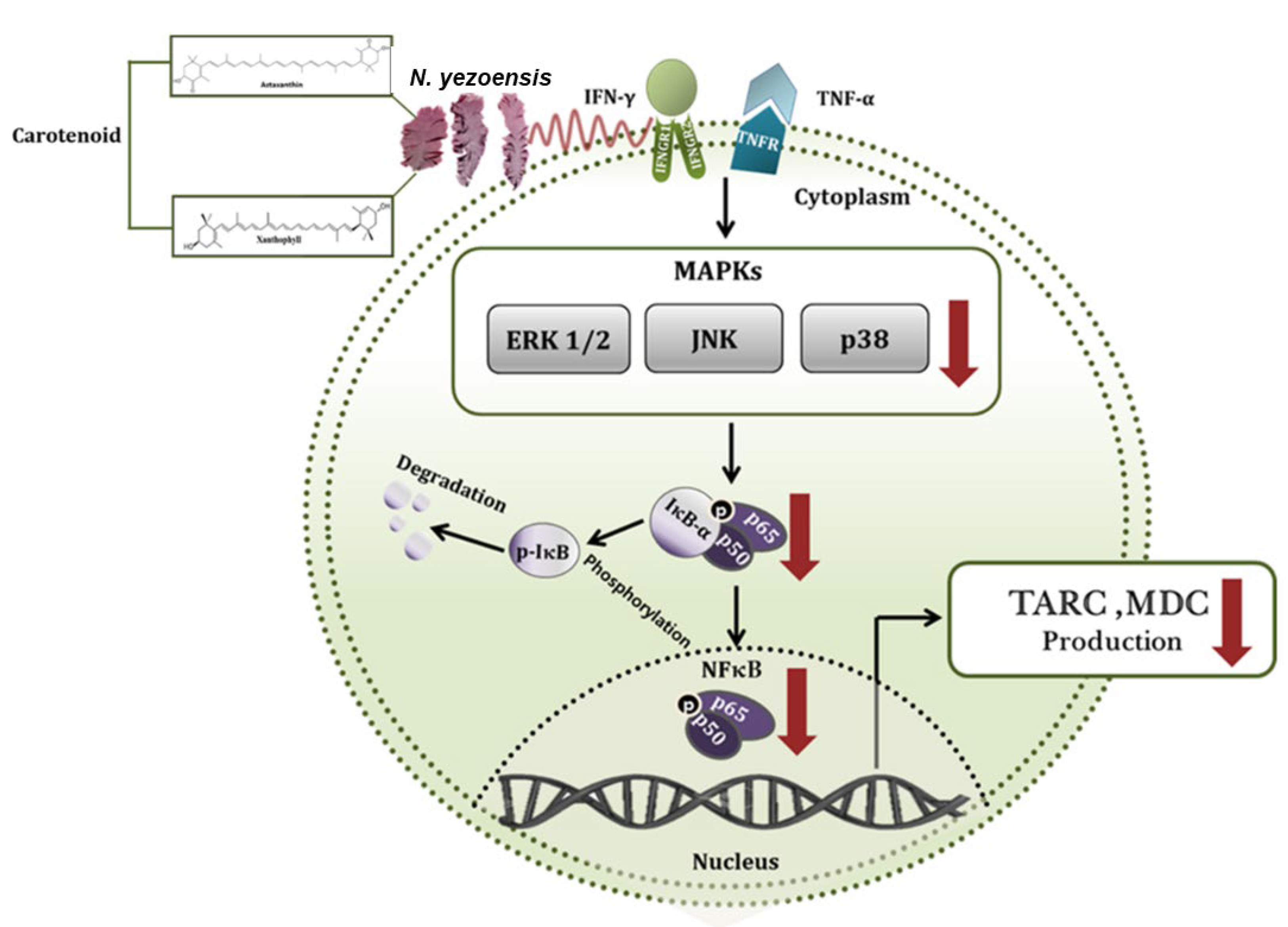 | N. yezoensis extract (PYE) | HaCaT Cells+ PYE (40, 200, and 1000 µg/mL), TNF-α or IFN-γ (10 ng/mL), 24 h | ↓ TARC, ↓ MDC, ↓ ERK, ↓ JNK, ↓ p38, ↓ NF-κB | [51] |