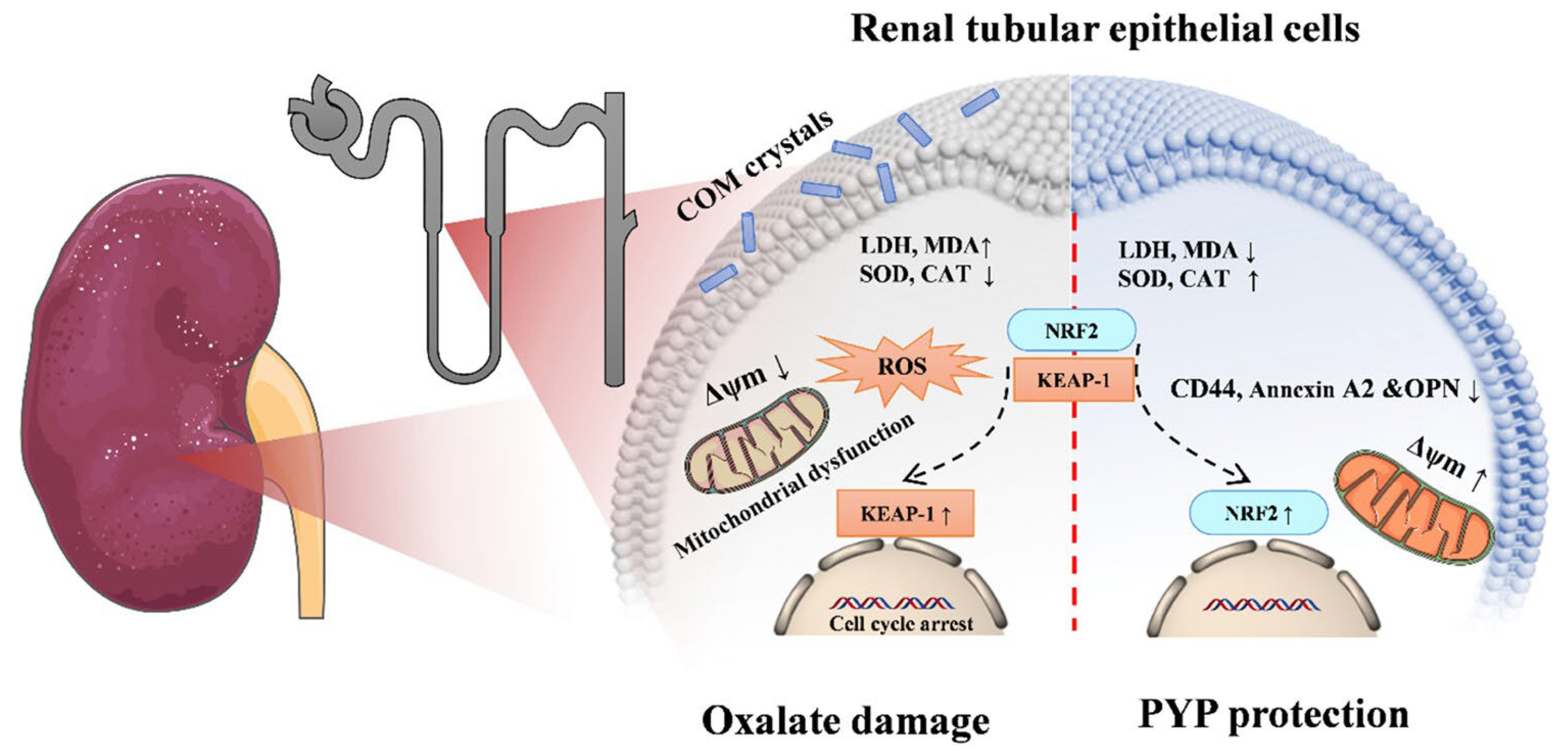 | Therapeutic evaluation: SD rats Normal group: standard diet Stone group: standard diet + ethylene glycol (1%), 28 days PYP group: ethylene glycol + 50, 200, and 400 mg/kg wt, 28 days, | Prevented CaOx crystal formation, deposition and adhesion risk: ↓ CD44 and ↓ OPN Inhibited renal injury ↓ Kim-1 (renal injury factor), ↑ SOD, ↑ CAT, ↑ Nrf2, ↓ keap1 ↓ IL-6, ↓ MCP-1 | ||