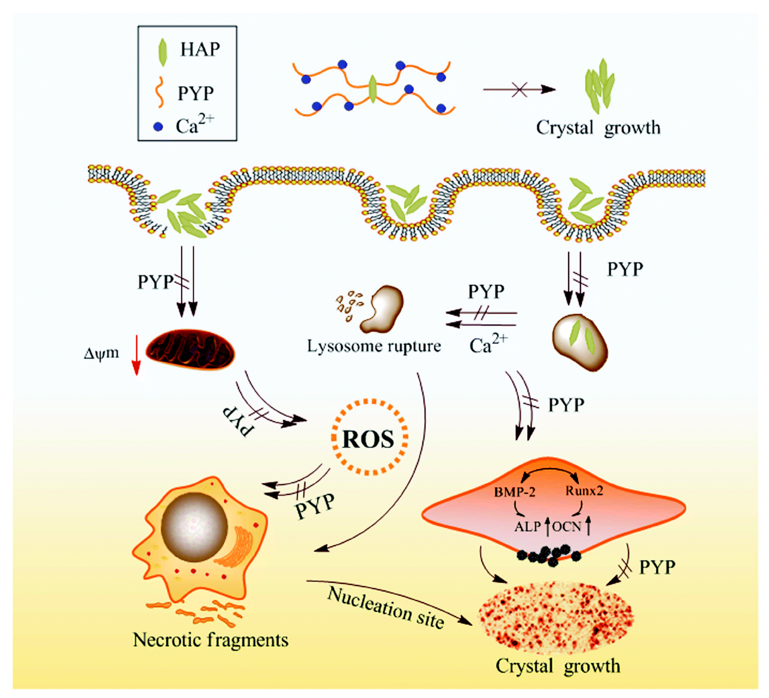 | Polysaccharides from N. yezoensis (PYP1-PYP4) | A7R5 cells + HAP (200 μg/mL) + PYP1-PYP4 (50, 100, 200, and 400 μg/mL), 24 h | Inhibited HAP damage, ↑ cell viability, Protecting effects 200 > 400 > 100 > 50 μg/mL. ↓ LDH release, ↓ ROS. Inhibited decline in mitochondrial membrane potential, Inhibited: intracellular calcium level, Ca deposition, ALP, HAP adhesion and endocytosis. ↓ cell necrosis, Inhibited osteogenic transformation: ↓ BMP-2, ↓ Runx2, ↓ OCN | [87] |