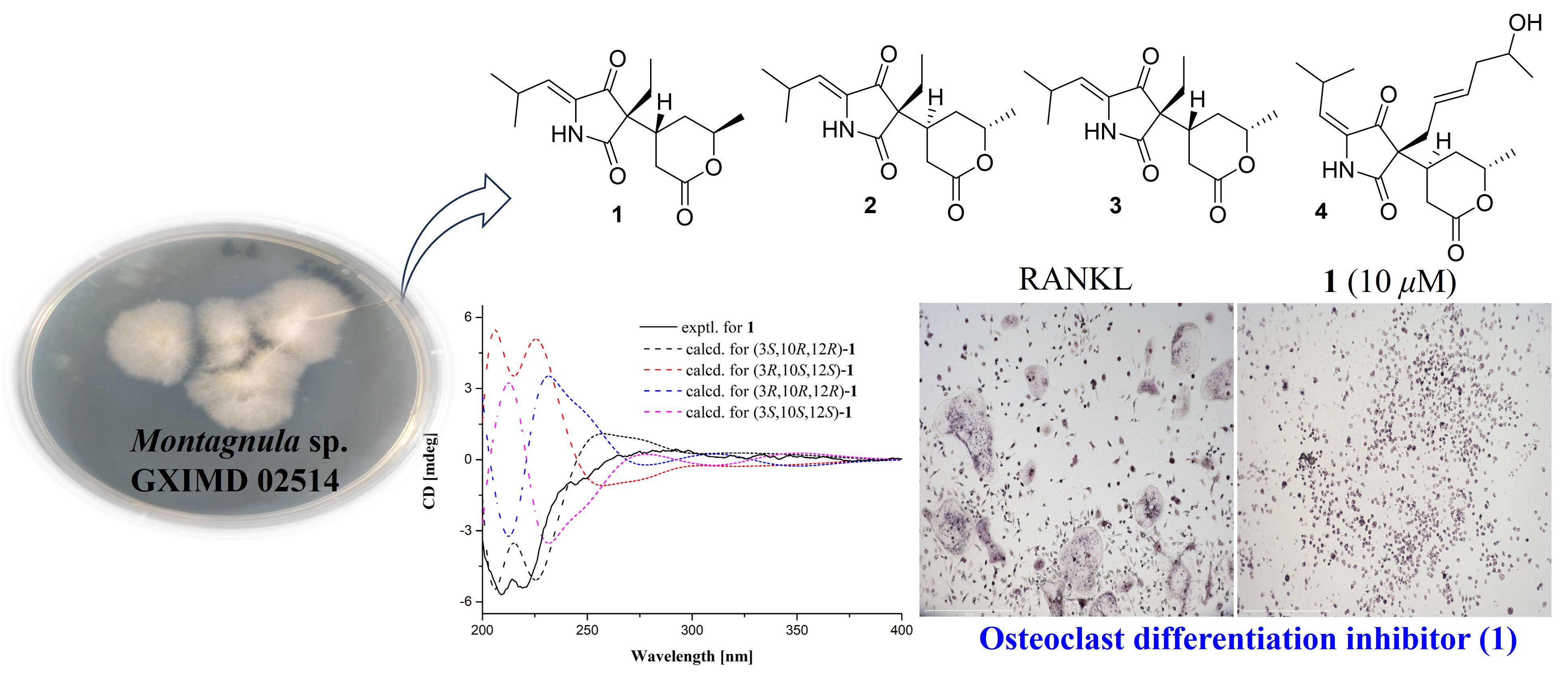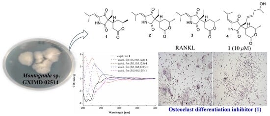 Lin, M.; Lu, H.; Wang, J.; Qin, H.; Xu, X.; Gao, C.; Liu, Y.; Tan, Y.; Luo, X. Montagnulans A–D with Anti-Osteoclastogenic Activity from the Marine Fungus Montagnula sp. GXIMD 02514. Mar. Drugs 2025, 23, 416. https://doi.org/10.3390/md23110416