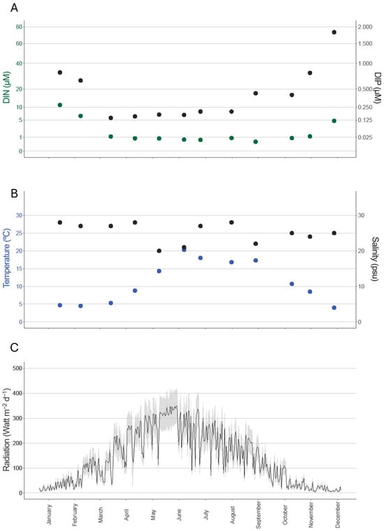 Seasonal variation in environmental parameters recorded at the sampling site: dissolved inorganic nitrogen (DIN, µM; green) and inorganic phosphorus (DIP, µM; black) in seawater (panel (A)); seawater temperature (°C; blue) and salinity (practical salinity units, black) (panel (B)); daily solar radiation (W m−2 d−1, mean ± SD) (pannel (C)). Data is shown across months from January to December.