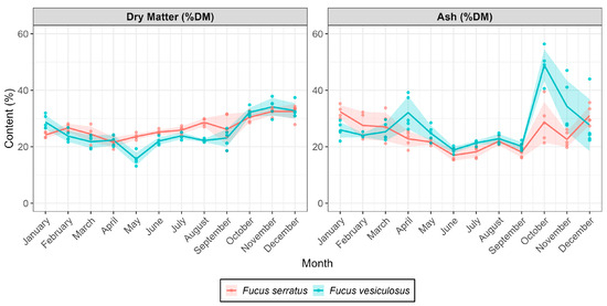 The dry matter (DM) content (% of FW) after freeze-drying and ash (% of DM) of FS and FV are presented in Figure 2. Stable content was observed for both species with slight variations according to the month of collection. The DM content for FS varied between 21.6% (April) and 29.4% (August), whereas the DM content for FV varied between 21.35% (May) and 31.1% (December). The variation in ash content (% of DM) throughout the 2023 season was similar to that of DM content, except for collections performed in October and November, when FV was highly overgrown with sinistral spiral tubeworms (Spirorbis sp. Linnaeus, 1758), resulting in a higher content of ash (Figure 2). The growth of Spirorbis on FS was not as pronounced as on FV. Spirorbis and related species are known to adhere externally to seaweed thalli and secrete rigid, coiled tubes composed predominantly of Mg-calcite [25]. Increased colonization on the seaweed surface can lead to decreased photosynthetic rates and growth of Fucus species [26]. The higher content of Mg-calcite, which leads to a high ash fraction in the harvested seaweed biomass, may lead to a mineral imbalance if the Fucus biomass is utilized as animal feed or soil fertilizer and can also decrease the proportion of fermentable organic compounds, like polysaccharides and bioactive molecules [27].