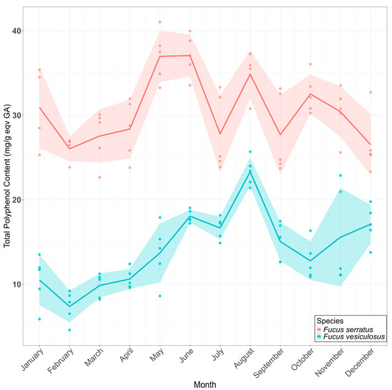 Total polyphenol content (TPC) in Fucus serratus and F. vesiculosus collected every month during a full year. Thick lines represent the average for each corresponding month. Data points represent independent biological replicates (n = 5 individual thalli), and the shaded areas represent the standard deviation from the mean.