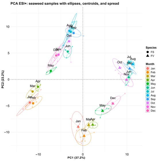Principal component analysis (PCA) of untargeted metabolomic profiles (ESI+ LC-HRMS) of Fucus serratus (FS, circles) and F. vesiculosus (FV, triangles). Colored ellipses (95% confidence intervals) and centroids indicate intra-month variation and seasonal grouping.