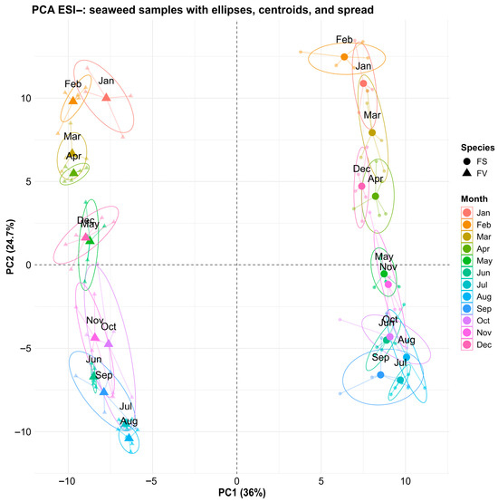 Principal component analysis (PCA) of untargeted metabolomic profiles (ESI− LC-HRMS) of Fucus serratus (FS, circles) and F. vesiculosus (FV, triangles). Colored ellipses (95% confidence intervals) and centroids indicate intra-month variation and seasonal grouping.