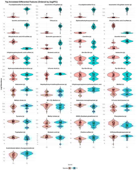 Top differentially abundant metabolites discriminating between Fucus serratus (FS) and F. vesiculosus (FV) detected in positive (p) and negative (n) ESI modes. Each plot represents the log2-transformed abundance of individual LC–HRMS features, ordered by absolute log2 fold change (log2FC) between species.