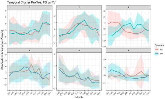Temporal clustering of metabolomic features from Fucus serratus (FS, red) and F. vesiculosus (FV, blue) across 12 sampling months using Mfuzz soft clustering. Each panel (clusters 1–6) shows the standardized abundance (Z-score) profile of metabolites grouped by similarity in temporal trends. Solid lines indicate mean standardized abundance, and shaded areas represent the 95% confidence interval across features within each cluster.