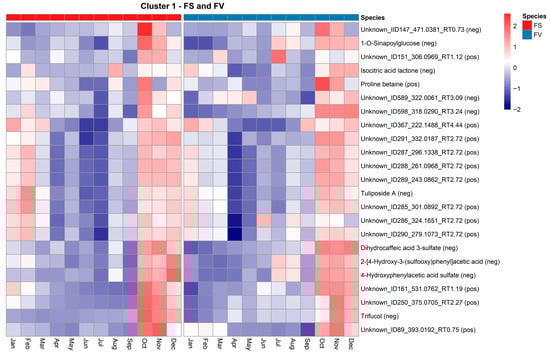 Apart from the species differences, we were able to follow the progression of metabolite intensity during the monthly collections and could observe temporal differences for specific metabolites. The results of the time-course clustering analysis using the untargeted metabolomics profiles of FS and FV are shown in Figure 7. To explore time-dependent shifts in metabolic profiles, soft clustering analysis was performed using the Mfuzz algorithm. Six temporal clusters were identified based on standardized metabolite abundance patterns (Z-scores) across the 12-month sampling period for both FS and FV. We observed that four clusters (Cluster 1, Cluster 2, Cluster 4, and Cluster 5) exhibited similar metabolite patterns over time for FS and FV, whereas Cluster 3 contained metabolites with opposite activities. Specifically, FS metabolites in cluster 3 showed increased activity in January, February, March, and April, followed by a gradual decrease in the summer-autumn months. On the other hand, FV metabolites in Cluster 3 showed increased activity in the summer months and a decrease towards late autumn and December.