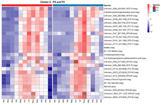 Cluster 2 captures metabolites with a mid-year peak in June–August (Figure 9). FV shows a more substantial and more defined increase compared to FS, indicating species-specific upregulation of summer-associated metabolites, particularly in June, July for FS and August for FV (Figure 7). We observed in Cluster 2 several annotated compounds, notably multiple mannitol-related features (e.g., mannitol [pos], [M + Cl]-mannitol, 2-deoxy-2-fluoro-D-glucitol) which exhibited peak abundance in mid-summer, particularly in FV (Figure 9).