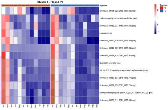 Heatmap of standardized abundance (Z-score) for metabolites in Cluster 5 in Fucus serratus (FS, red bar) and F. vesiculosus (FV, blue bar). Each cell represents the standardized abundance (z-score) of a metabolite, with red indicating higher relative abundance and blue indicating lower relative abundance within each species. The z-scores range from −2 (lowest) to +2 (highest), based on normalized LC–HRMS intensity values.