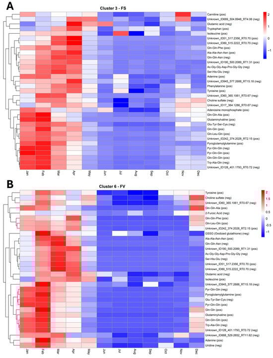 Heatmap of standardized abundance (Z-score) for metabolites in Cluster 3 of Fucus serratus (FS, panel (A)) and Cluster 6 of F. vesiculosus (FV, panel (B)). Each cell represents the standardized abundance (z-score) of a metabolite, with red indicating higher relative abundance and blue indicating lower relative abundance within each species. The z-scores range from −2 (lowest) to +2 (highest), based on normalized LC–HRMS intensity values.