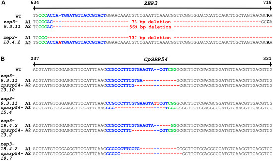Overview of indels in the zeaxanthin epoxidase 3 (ZEP3) and chloroplast signal recognition particle 54 (CpSRP54) genes. (A) Indels in the ZEP3 gene in the zep3 single knockout (KO) lines that were subjected to CRISPR/Cas9-mediated mutagenesis to create zep3cpsrp54 double KO lines. (B) Indels in the CpSRP54 gene in the zep3csrp54 double KO lines. Blue characters: target sequences; red characters: indels; green characters: protospacer adjacent motifs (PAMs). The PAM for the ZEP3 target site is located on the reverse strand.
