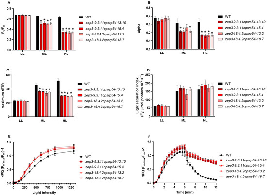 Both P. tricornutum zep3 and cpsrp54 single KO mutants have altered photophysiological features [30,32,43,46,49]. The zep3 mutants are unable to relax the NPQ response after induction [30,32,49], whereas the cpsrp54 mutants display elevated NPQ levels and reduced photosynthetic performance at increased light intensities compared with WT [43,46]. To determine whether the zep3cpsrp54 double KO combined these characteristics, the photophysiological responses to low light (LL; 35 μmol photons m−2 s−1), medium light (ML; 200 μmol photons m−2 s−1), and high light (HL; 450 μmol photons m−2 s−1) were compared with WT responses. Under LL, the double KO exhibited photosynthetic performance comparable to WT and the two single mutants (Figure 2A–D) [30,46], indicating that the double KO does not impair photosynthesis under these conditions. In contrast, the double KO mutants treated with ML and HL displayed decreased photosynthetic (PSII) efficiency (Fv/Fm), maximum light utilisation coefficient (alpha), and photosynthetic capacity (maximum relative electron transport rate (rETRmax)), and elevated NPQ levels compared with WT (Figure 2A–C,E,F) consistent with the phenotype previously described for cpsrp54 mutants [46]. As for the zep3 single KO mutants [30], NPQ levels stayed high during the relaxation phase in very low intensity light (8 µmol photons m−2 s−1 of blue light) in the double KO mutants (Figure 2F). NPQ is known to be linearly correlated with the Dtx concentration in pennate diatoms [50,51,52], meaning that elevated NPQ levels observed during the relaxation phase for the double KOs imply that Dtx is not immediately converted back to Ddx when the cells are no longer experiencing high light stress. Consistent with results previously reported for zep3 single mutants [30,49], the double KOs displayed an abrupt decline in NPQ during the first 30 seconds of recovery, followed by relatively stable high NPQ levels at the subsequent measuring points. This decrease is assumed to be independent of Dtx, but the mechanism behind the phenomenon is unknown [49].