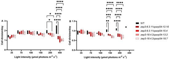 Growth rates of zep3cpsrp54 double KO mutants compared with WT at different light intensities and temperatures. WT and four zep3cpsrp54 mutant lines were cultivated at 35, 70, 100, 150, 200, and 450 μmol photons m−2 s−1 of white light at (A) 15 °C and (B) 10 °C. The maximum number of cell divisions per day during the exponential phase was calculated from four biological replicates from each line. Asterisks describe significant differences between zep3cpsrp54 and WT as indicated by two-way ANOVA with Dunnett’s multiple comparison tests (p < 0.05).
