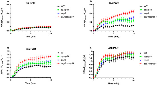 NPQ induction in cpsrp54, zep3, zep3cpsrp54, and WT as a response to constant light of different light intensities. NPQ was calculated as a function of time where the cells were exposed to (A) 58 µmol photons m−2 s−1, (B) 124 µmol photons m−2 s−1, (C) 245 µmol photons m−2 s−1, and (D) 470 µmol photons m−2 s−1 of blue light for 10 min. Two different lines were included in the experiment for cpsrp54 (cpsrp54-11, cpsrp54-20) and zep3 (zep3-9.3.11, zep3-18.4.2), and four different lines were included for zep3cpsrp54 (zep3-9.3.11cpsrp54-13.10, zep3-9.3.11cpsrp54-15.4, zep3-18.4.2cpsrp54-13.2, zep3-18.4.2cpsrp54-18.7). Three biological replicates were included for each of the mutant lines, meaning that the total number of samples was n = 6 for zep3 and cpsrp54; n = 12 for zep3cpsrp54; and n = 3 for WT. The graphs are based on the means of all lines and replicates for each mutant or WT. Data for the individual lines can be found in Supplementary Figure S2. Significant differences between zep3cpsrp54 and the other lines for each time point and light intensity were investigated by performing a two-way ANOVA with Dunnett’s multiple comparison tests. The results of the statistical analyses are included in Supplementary Table S1.
