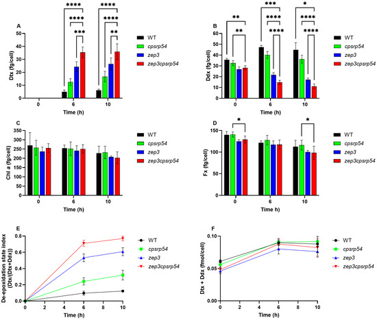 The results described in Section 2.3 indicate that NPQ, and therefore presumably also Dtx production, can be triggered to a relatively high level without the use of high light intensities in zep3cpsrp54 double KOs. To test this hypothesis, we exposed the same mutant lines as used for the NPQ experiments to ML for 6 h and 10 h. The time points were based on when P. tricornutum cpsrp54 mutants and/or WT showed the highest level of Dtx production and lowest level of Fv/Fm when exposed to light stress in previous studies [33,46]. Consistent with NPQ data, pigment analysis revealed that ML was sufficient to induce substantial Dtx accumulation in the double KO, and that the double KOs contained the highest concentrations of Dtx, followed, in decreasing order, by zep3, cpsrp54, and WT (Figure 5A), confirming a cumulative effect of combining the two mutations. The opposite trend was observed for the Ddx concentration (Figure 5B). The Dtx production in the double KOs clearly outperformed the production in the single KO lines, demonstrating Dtx concentrations that were 46% and 36% higher than in zep3 lines after 6 h and 10 h of ML treatment, respectively. The Dtx concentration in the double KOs after 6 h in ML reached similar levels as previously reported for zep3 single mutants exposed to HL for 2 h [30]. Even though the concentration of Dtx differed significantly between mutant lines, they were highly similar for the same mutant line at both 6 h and 10 h (Figure 5A). These results suggest that exposing the cells to 10 h of ML to produce Dtx would be a waste of light energy if using the double KOs to produce Dtx in a future large-scale production setting. The changes in the de-epoxidation state (DES) index and the total pool of photoprotective pigments (Dtx + Ddx) were also minimal between the two ML light exposure time points (Figure 5E,F). As previously reported for the cpsrp54 and the zep3 single mutants, Chl a and Fx concentrations were highly similar between all lines and in all conditions (Figure 5C,D) [30,46].