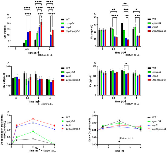 Pigment levels and DES index in LL-acclimated cpsrp54, zep3, zep3cpsrp54, and WT cells after a shift to ML followed by being returned to LL. Cellular pigment contents (fg/cell) are shown for (A) Dtx, (B) Ddx, (C) Chl a, and (D) Fx in cpsrp54, zep3, zep3cpsrp54, and WT after exposure of LL (35 µmol photons m−2 s−1) acclimated cells (0 h) to 0.5 and 2 h of ML (200 µmol photons m−2 s−1). The cultures were returned to LL for 2 h after 2 h of ML treatment (corresponding to the 4 h time point in the above figure). Two different lines were included in the experiment for cpsrp54 (cpsrp54-11, cpsrp54-20) and zep3 (zep3-9.3.11, zep3-18.4.2), and four different lines were included for zep3cpsrp54 (zep3-9.3.11cpsrp54-13.10, zep3-9.3.11cpsrp54-15.4, zep3-18.4.2cpsrp54-13.2, zep3-18.4.2cpsrp54-18.7). Three biological replicates were included for each of the mutant lines, meaning that the total number of samples was n = 6 for zep3 and cpsrp54; n = 12 for zep3cpsrp54; and n = 3 for WT. The graphs are based on the means of all lines and replicates for each mutant or WT. Asterisks for figures (A–D) describe significant differences between zep3cpsrp54 and the other lines as indicated by two-way ANOVA with Dunnett’s multiple comparison tests (p < 0.05). (E) DES index (DES = Dtx/(Dtx + Ddx)) calculated from data shown in (A,B) after conversion to fmol/cell. (F) Changes in the total pool of Dtx + Ddx (fmol/cell) as a response to the different light treatments.