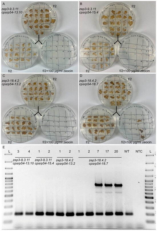 Identification of non-transgenic zep3cpsrp54 double KO mutants. Twenty colonies derived from single cells from (A) zep3-9.3.11cpsrp54-13.10, (B) zep3-9.3.11cpsrp54-15.4, (C) zep3-18.4.2cpsrp54-13.2, and (D) zep3-18.4.2cpsrp54-18.7 cultures were patched on 50% seawater (SW) f/2 agar plates. After around two weeks of growth, material was transferred to new 50% SW f/2 agar plates without zeocin or with zeocin (100 µg/mL). Only colonies still containing the pPtPuc3m-Cas9_sgRNA plasmid can survive on selection plates containing 100 µg/mL zeocin since the plasmid contains the ShBle gene conferring resistance to zeocin [44]. The presented pictures were taken eleven days after patching. (E) Loss of pPtPuc3m-Cas9_sgRNA plasmid was verified by the inability to amplify a PCR product from the plasmid’s origin of replication (855 bp). A genomic control fragment (Phatr2_52110; 188 bp) was co-amplified as a positive control. Two colonies from each double KO line no longer able to grow on selection plates were selected for PCR verification. In addition, three colonies (colony 7, 17, and 20) from line zep3-18.4.2cpsrp54-18.7 that could still grow on selection plates were included as positive controls, and WT was included as a negative control. Numbers above lanes correspond to colony numbers on the agar plates. Abbreviations used are L: Ladder (GeneRuler 1 kb Plus DNA Ladder (ThermoFisher Scientific)); WT: Wild-type P. tricornutum; NTC: No template control.