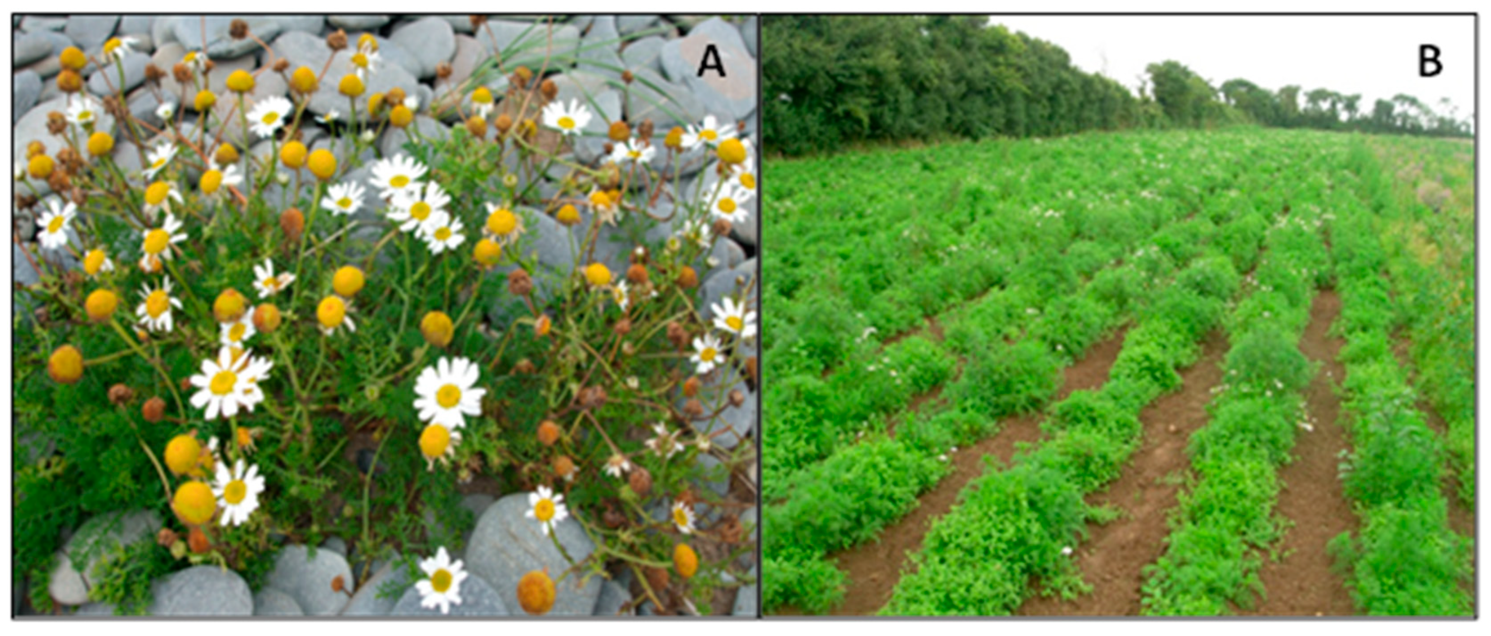 - Sharifi-Rad, M.; Nazaruk, J.; Polito, L.; Bezerra Morais-Braga, M.F.; Rocha, J.E.; Melo Coutinho, H.D.; Salehi, B.; Tabanelli, G.; Montanari, C.; del Mar Contreras, M.; et al. Matricaria genus as a source of antimicrobial agents: From farm to pharmacy and food applications. Microbiol. Res. 2018, 215, 76–88. [Google Scholar] [CrossRef]