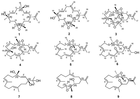 Structurally, cembrane diterpenoids possess a 14-membered isoprenoid macrocyclic backbone characterized by an isopropyl group at C-1 and methyl groups located at C-4, C-8, and C-12 (Figure 1). The basic structure of this diterpene usually presents cyclic ether, lactone, or furan moieties around the macrocyclic ring. Due to extensive functional group variation, including lactone, epoxide, furan, ester, aldehyde, hydroxyl, and carboxyl moieties, as well as cyclization diversity, cembrane diterpenoids can be categorized into several subclasses, including simple cembranes, cembranolides, furanocembranoids, and biscembranoids [4]. The 14-membered carbocyclic nucleus of cembranolides is often bonded to a lactone ring with five, six, seven, or eight members [4]. Furanocembranoids feature a furan heterocycle and a 14-membered carbocyclic nucleus. Additionally, they include a butenolide moiety that includes C-10, C-12, and C-20. Biscembranoids have a tricyclic backbone of tetraterpenoids with 14–6–14 members. These compounds demonstrate a wide spectrum of biological activities, such as anti-cancer, neuroprotective, antimicrobial, antiviral, antidiabetic, antifouling, and anti-inflammatory effects [3,5,6].