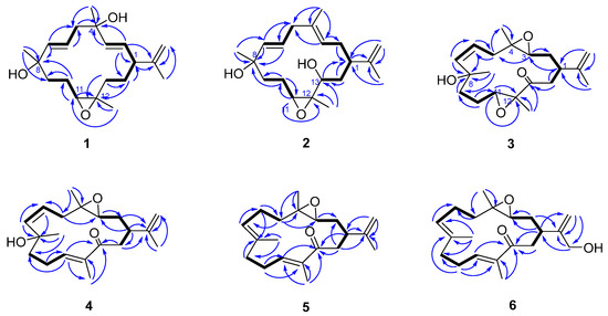 1H-1H COSY and key HMBC correlations of compounds 1–6.