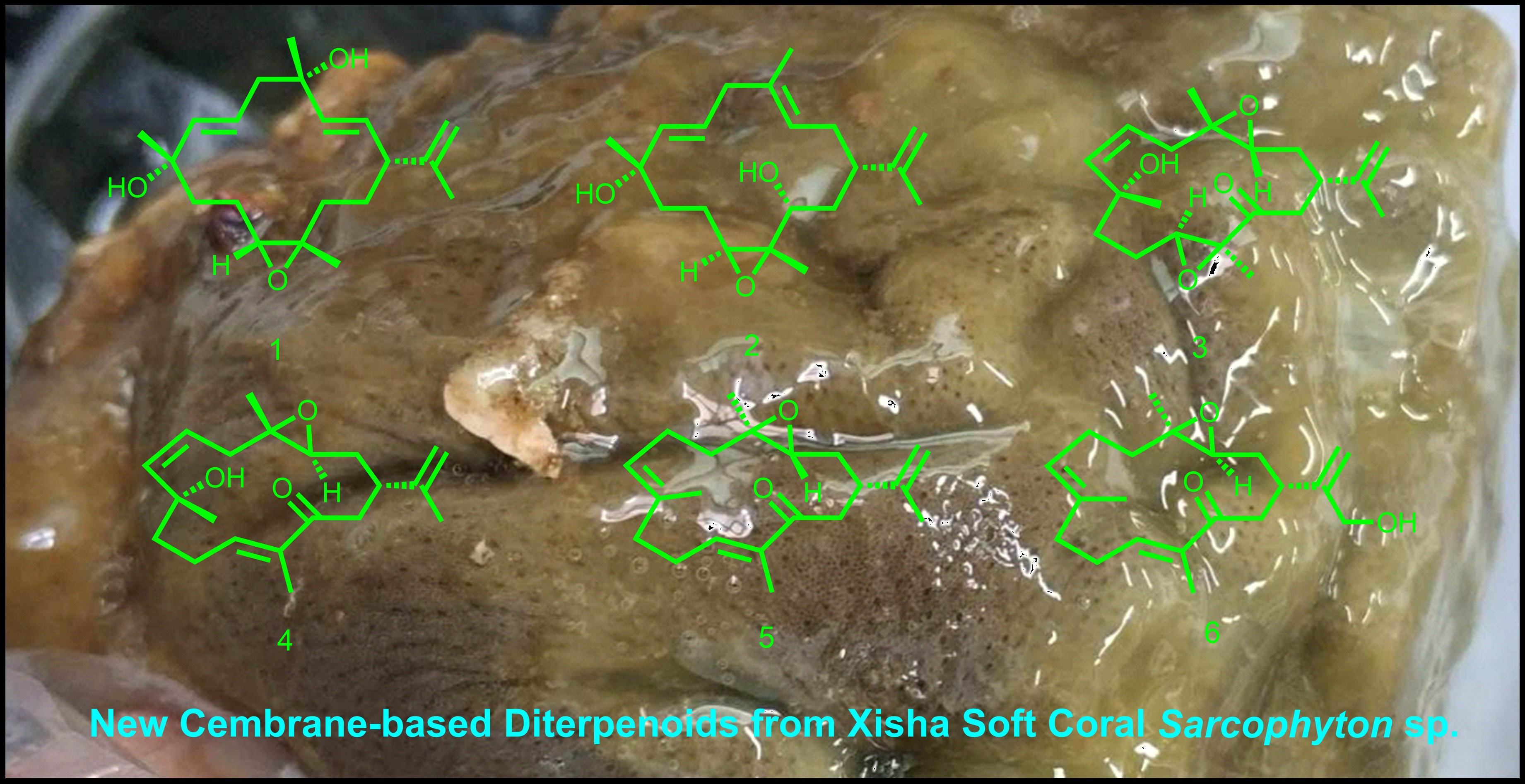 - Ren, L.; Leng, X.; Li, T.; Liu, J.; Wang, W.; Yan, X.; Yan, X.; He, S. Four new cembranoids from the South China Sea soft coral Sarcophyton trocheliophorum. Nat. Prod. Res. 2023, 37, 39–46. [Google Scholar] [CrossRef] [PubMed]