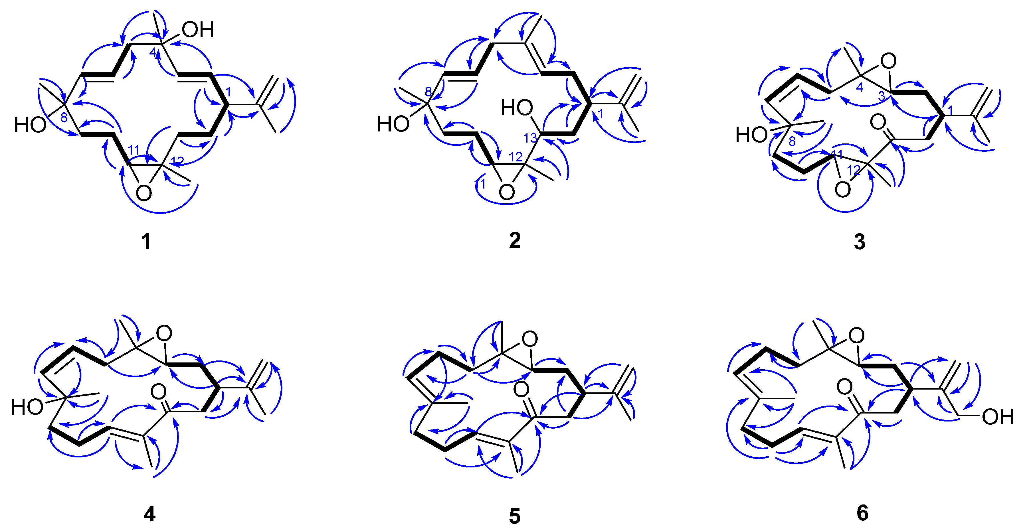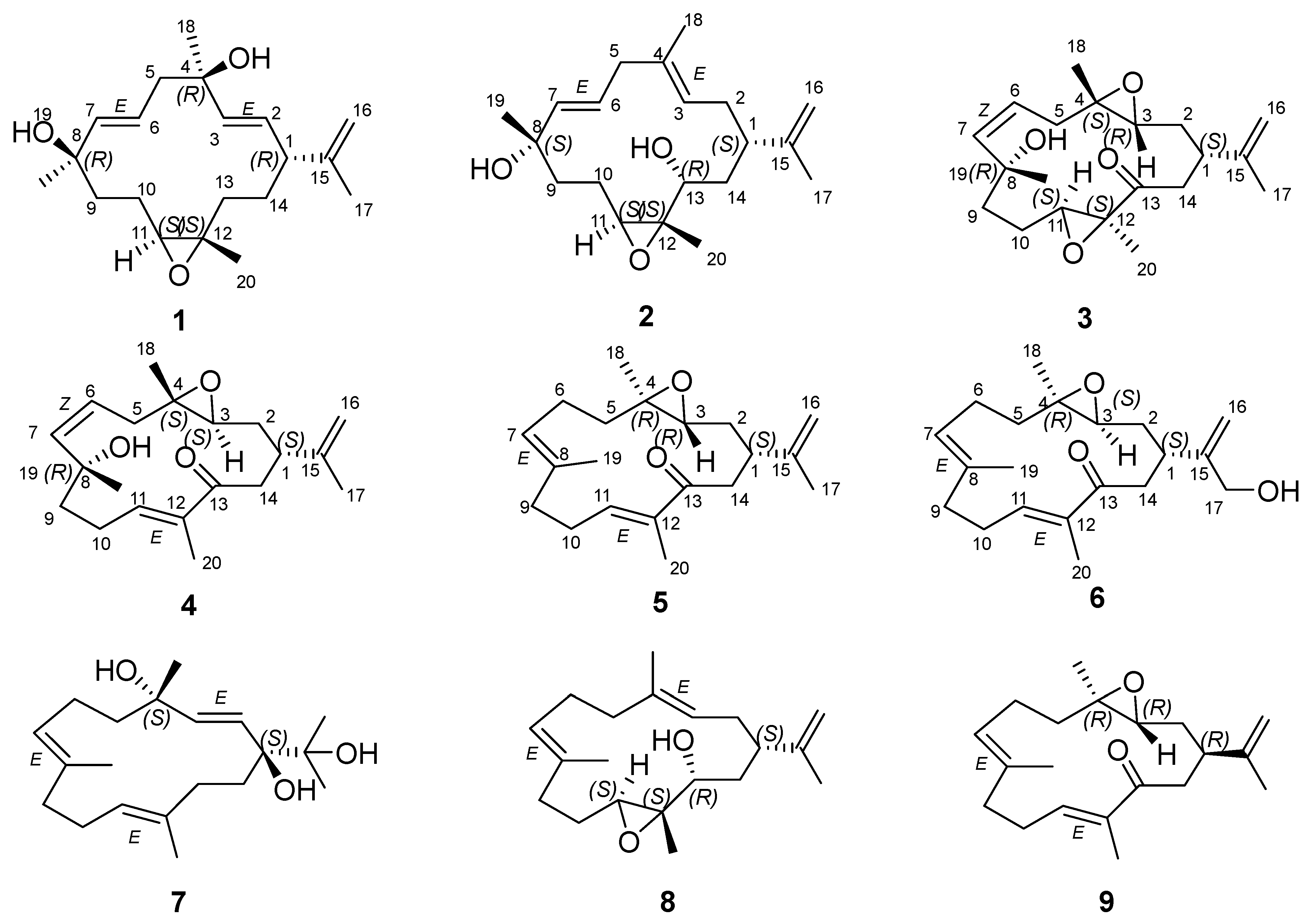 - Lin, S.-T.; Wang, S.-K.; Duh, C.-Y. Cembranoids from the Dongsha Atoll soft coral Lobophytum crassum. Mar. Drugs 2011, 9, 2705–2716. [Google Scholar] [CrossRef] [PubMed]