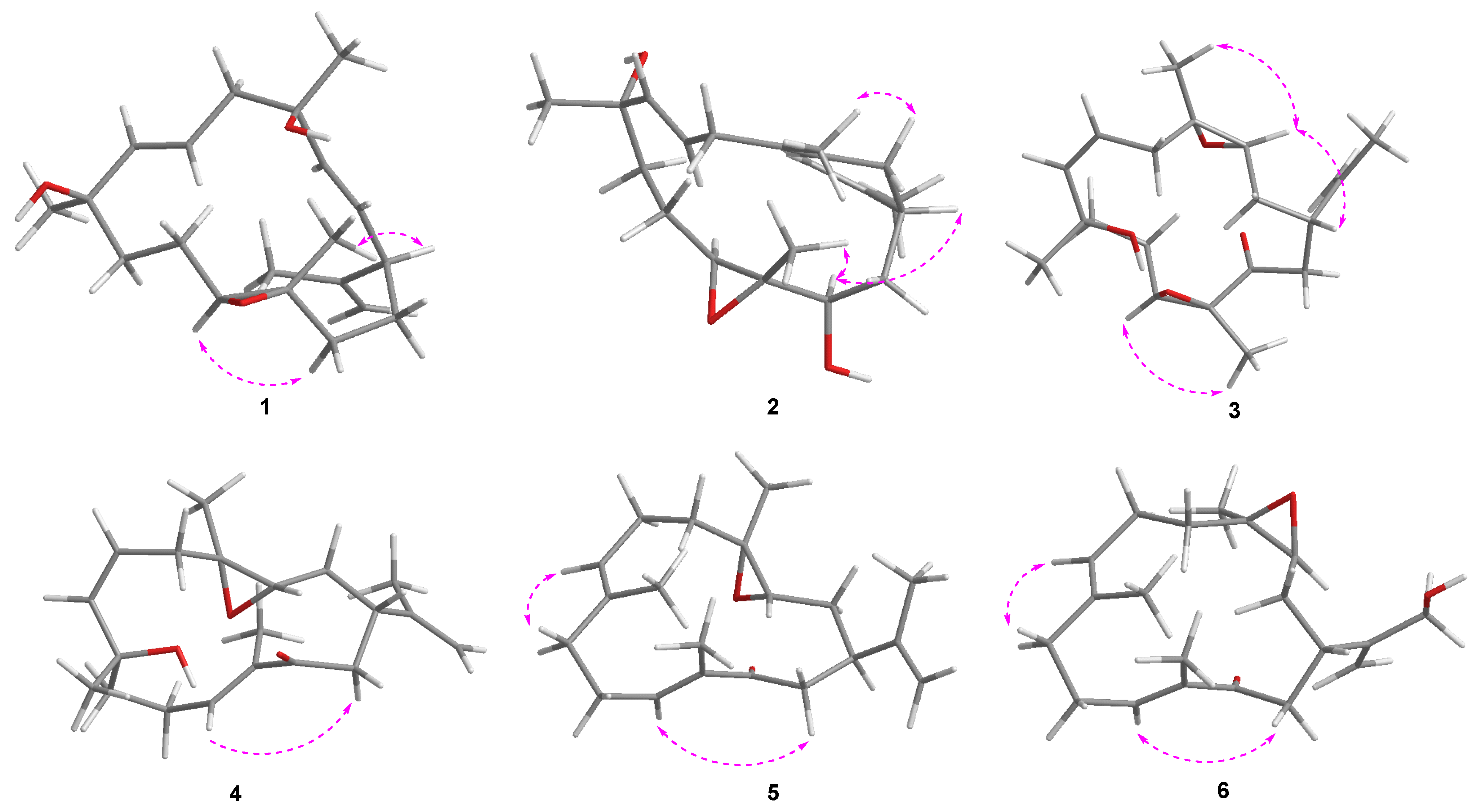 - Li, S.-W.; Cuadrado, C.; Yao, L.-G.; Daranas, A.H.; Guo, Y.-W. Quantum mechanical–NMR-aided configuration and conformation of two unreported macrocycles isolated from the soft coral Lobophytum sp.: Energy calculations versus coupling constants. Org. Lett. 2020, 22, 4093–4096. [Google Scholar] [CrossRef]