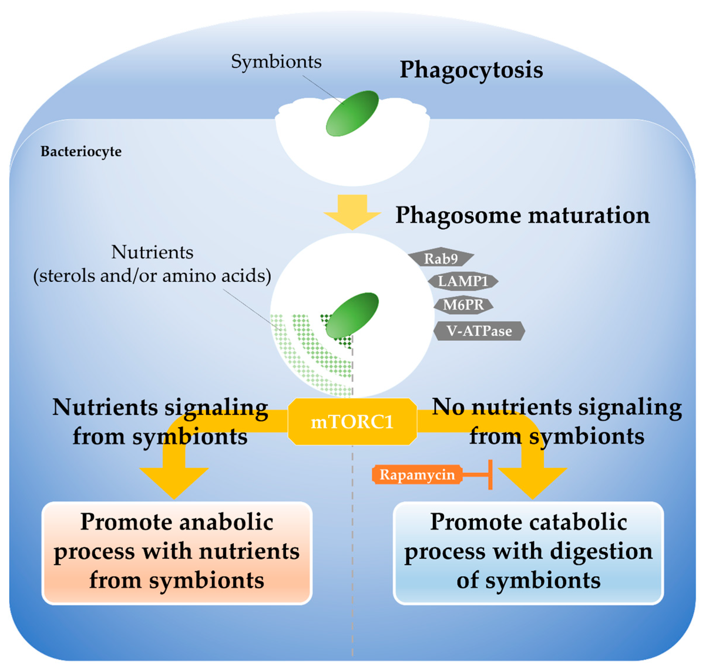 - Elucidating bidirectional metabolic signals between symbionts and mTORC1: To gain a deeper understanding of the nutritional control network in symbiosis, it is necessary to clarify how symbiont-derived metabolites (e.g., amino acids, lipids, and sterols) affect host mTORC1 activity and downstream phagosome digestion processes, using methods such as metabolic inhibition experiments.