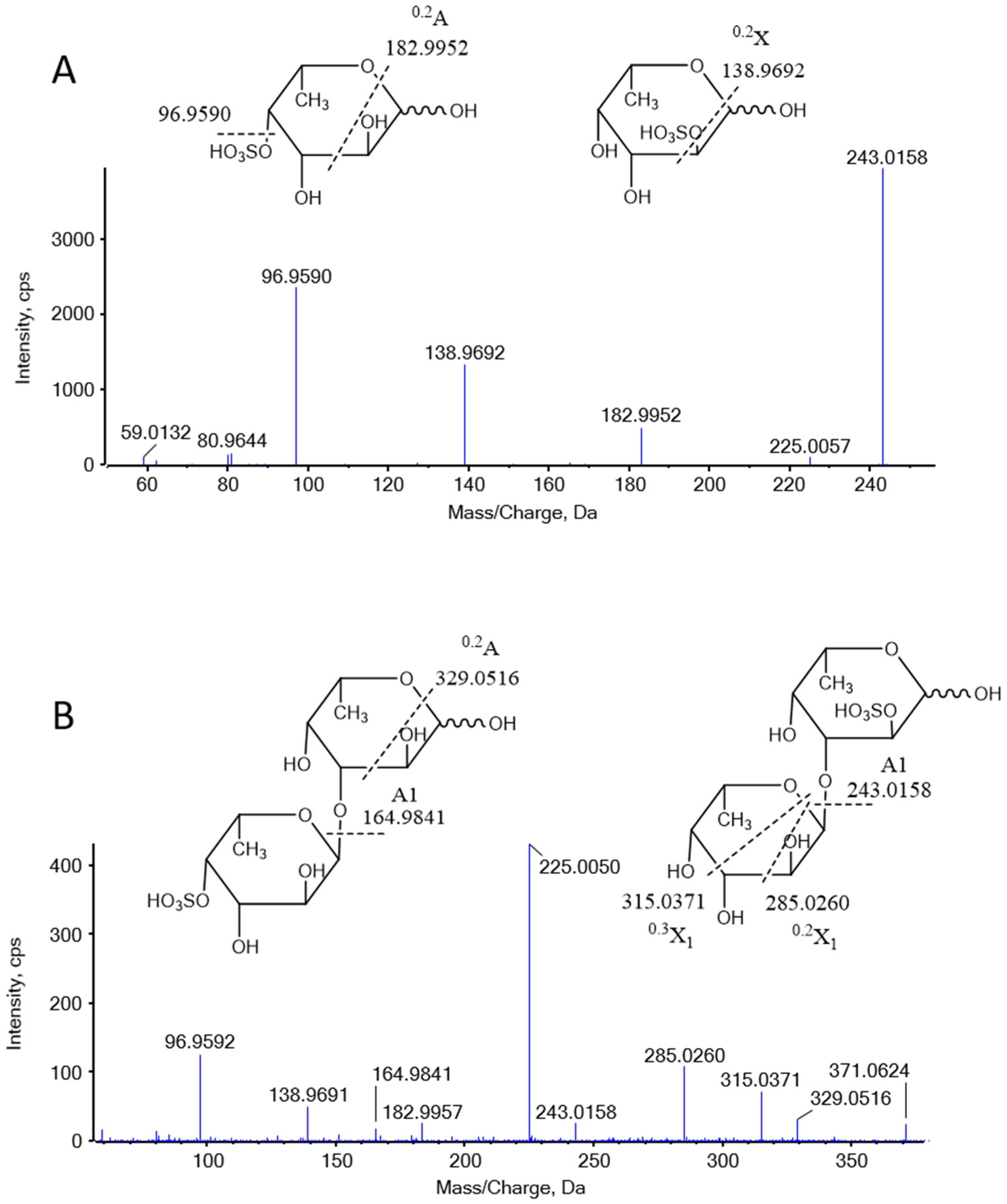 | 2,4-Me2-Fuc | 1,3-Fucp | 43, 57, 71, 85, 89, 101, 117, 131, 159, 173, 189 | 47.25 | 62.28 |