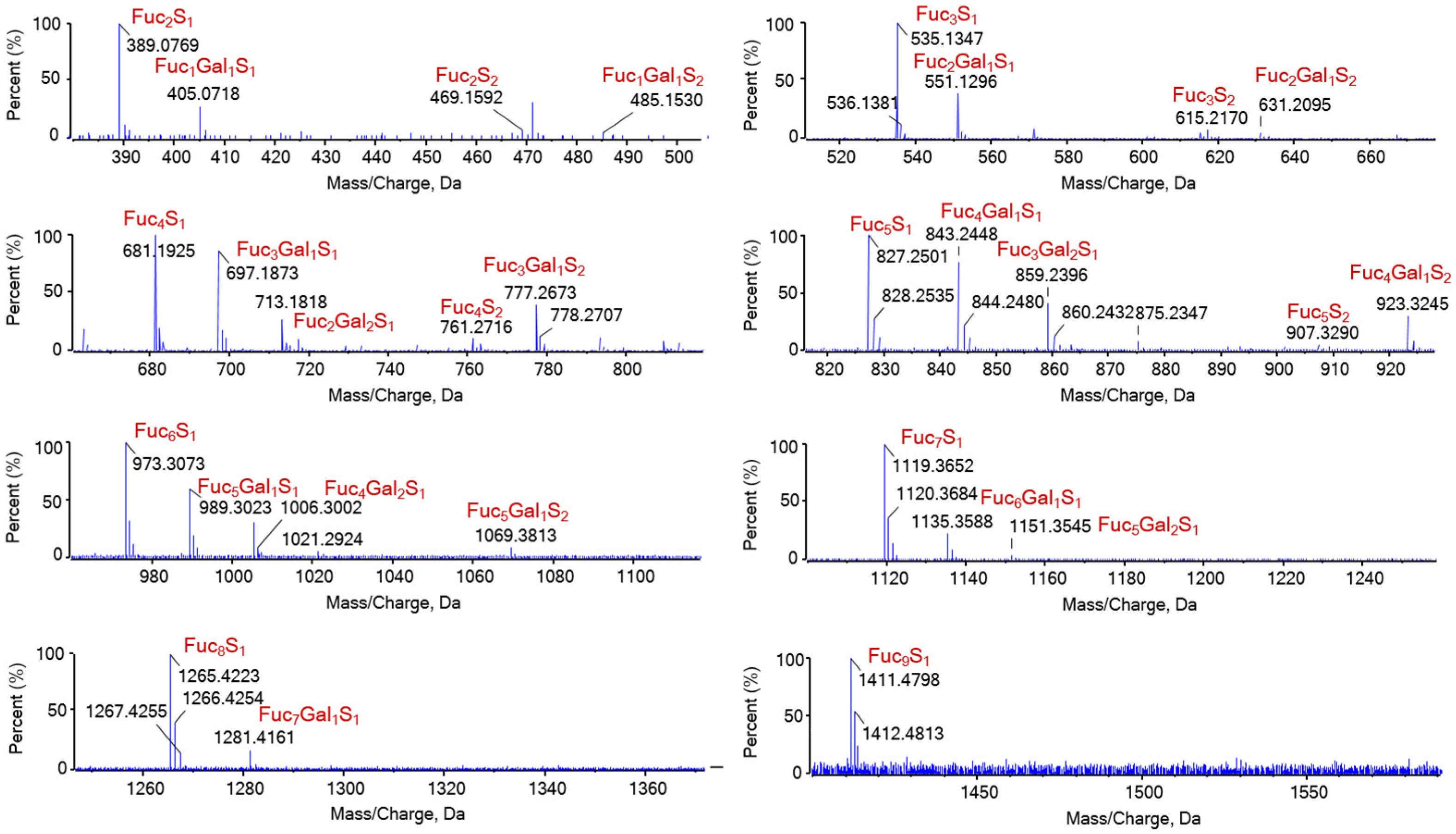| Sample | Total Sugar (%) | Protein (%) | Uronic Acid (%) | Sulfate Content (%) | Mw (kDa) | Monosaccharide (%) | ||||||
