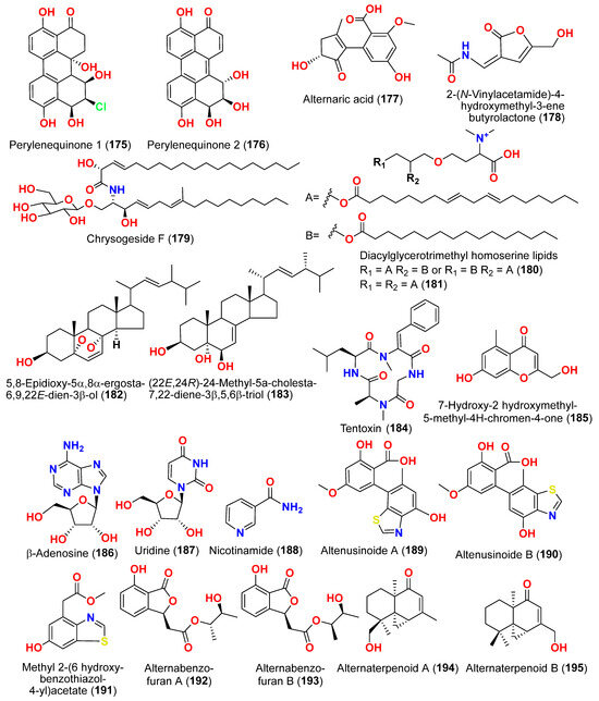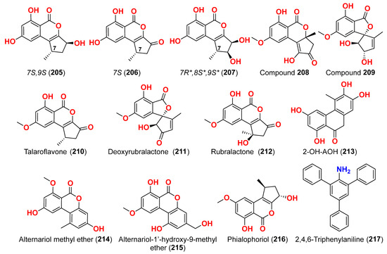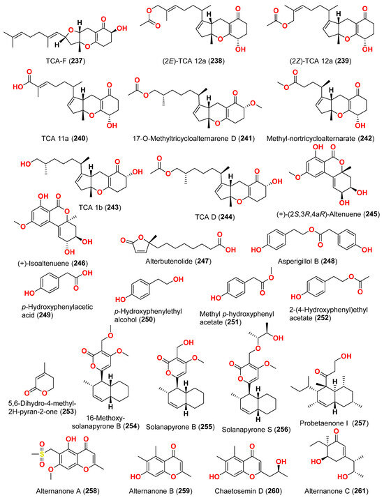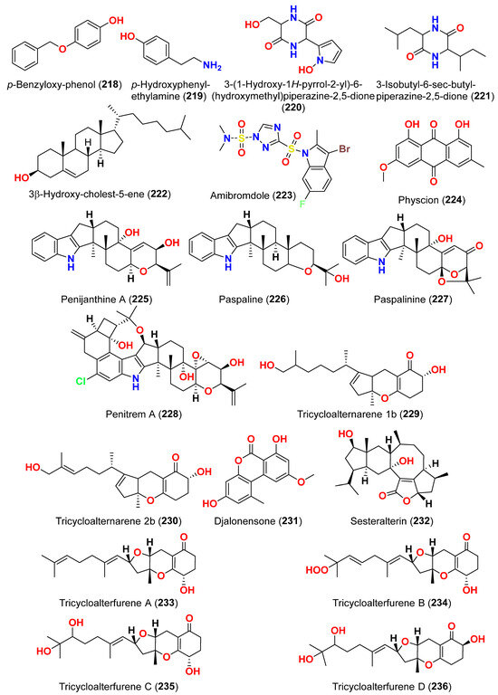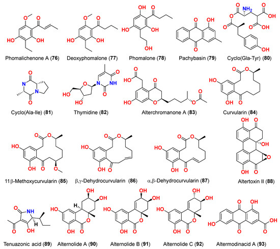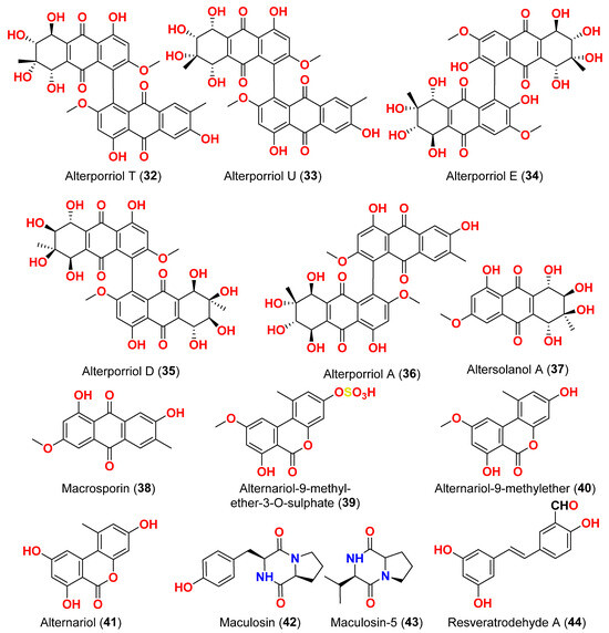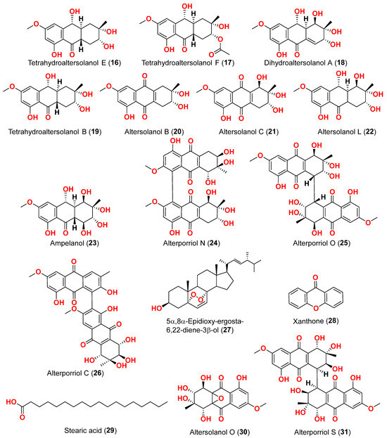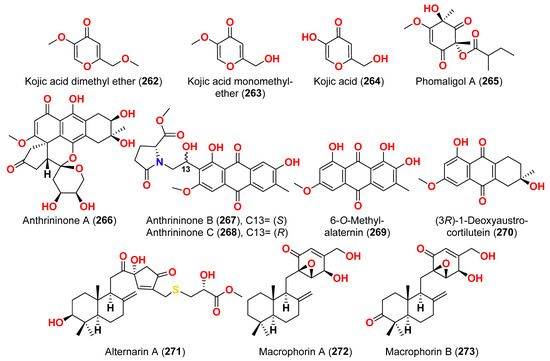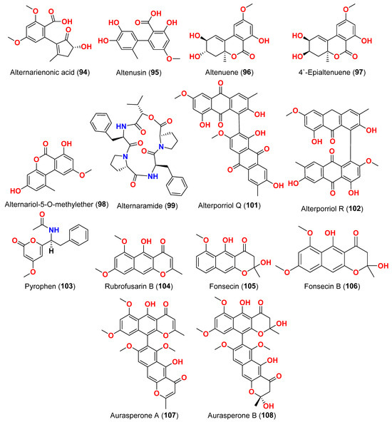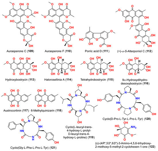 The compounds pyrophen (103), rubrofusarin B (104), fonsecin (105), and fonsecin B (106), together with dimers of naphtha-pyrones, aurasperone A (107), aurasperone B (108), aurasperone C (109), and aurasperone F (110), were obtained from the fungus Alternaria alternata strain D2006 cultures [36]. The fungus was isolated from a soft coral, Denderonephthya hemprichi, collected from the Red Sea, Egypt [36]. The antimicrobial activity of these compounds was assessed by the agar diffusion method against 11 microorganisms. The fungal strain’s crude extract was highly effective against bacteria and yeast. However, only three of the isolated metabolites revealed activity; pyrophen (103) and rubrofusarin B (104) exhibited significant antifungal activities with inhibition zones of 28 and 12 mm against C. albicans, respectively. Additionally, aurosperone A (107) was effective (inhibition zone = 13 mm) against the plant-pathogenic fungus Rhizoctonia solani [36]. Altenusin (95) and a dibenzofuran derivative, porric acid D (111), were recovered from the marine fungus Alternaria sp. identified from Bohai Sea, Tianjin seawater [37]. Using agar diffusion, the antimicrobial effect of the compounds against Staphylococcus aureus was evaluated. Compounds 95 and 111 inhibited S. aureus with MIC values of 86.2 and 347.2 μM, respectively [37]. Alterporriol S (31), an anthranoid dimer of the alterporriol class, was discovered in the mangrove plant Excoecaria agallocha-associated fungus Alternaria sp. SK11 in the South China Sea [38]. In addition, seven anthraquinone derivatives, (+)-α-S-alterporriol C (112), hydroxybostrycin (113), halorosellinia A (114), tetrahydrobostrycin (115), 9α-hydroxydihydrodesoxybostrycin (116), austrocortinin (117), and 6-methylquinizarin (118) were also identified. All the compounds were evaluated for their ability to inhibit the Mycobacterium tuberculosis protein tyrosine phosphatase B (MptpB), using sodium orthovanadate as a standard. The findings showed that compound 112 is a strong inhibitor of MptpB with an IC50 value of 8.7 μM [38]. A cyclic tetrapeptide cyclo(l-leucyl-trans-4-hydroxy-l-prolyl-d-leucyl-trans-4-hydroxy-l-proline) (119) was identified from the co-culture broth of two mangrove fungi Phomopsis sp. K38 and Alternaria sp. E33 from Guangdong Province, China [39]. The dilution approach revealed that compound 119 showed moderate to high inhibitory activity against four crop-threatening fungi, including Rhizoctonia cerealis, Gaeumannomyces graminis, Fusarium graminarum, and Helminthosporium sativum. The MIC values of compound 119 against H. sativum were comparable to those of the positive control, triadimefon [39]. Two tetracyclopeptides were extracted from the broth of two mangrove fungi, Phomopsis sp. K38 and Alternaria sp. E33: cyclo(d-Pro-l-Tyr-l-Pro-l-Tyr) (120) and cyclo(Gly-l-Phe-l-Pro-l-Tyr) (121) [40]. The dilution technique was utilized to examine antifungal activity and moderate to strong activity against Candida albicans, Gaeumannomyces graminis, Helminthosporium sativum, Rhzioctonia cerealis, and Fusarium graminearum was observed, comparing to the positive control. Cyclo(Gly-l-Phe-l-Pro-l-Tyr) (121) was more active (MIC = 53.8–538.7 µM) than cyclo(d-Pro-l-Tyr-l-Pro-l-Tyr) (120) (MIC = 67.3–769.2 µM) [40].