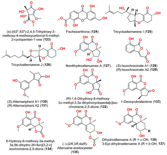 The racemic compounds of cyclohexenone and cyclopentenone derivatives, namely (±)-(4R*,5S*,6S*)-3-amino-4,5,6-trihydroxy-2-methoxy-5-methyl-2-cyclohexen-1-one (122) and (±)-(4S*,5S*)-2,4,5-trihydroxy-3-methoxy-4-methoxycarbonyl-5-methyl-2-cyclopenten1-one (123), as well as fischexanthone (124), were obtained from the fungus Alternaria sp. R6, derived from the marine semi-mangrove plant Myoporum bontioides A collected from Guangdong Province, China [41]. The antimicrobial activity of these compounds was evaluated. Compounds 122–124 displayed no activities either against Gram-positive bacterium Staphyloccocus aureus nor against Gram-negative bacterium Escherichia coli with MIC value ≥ 1265.82 μM [41]. Investigation of the sediment-derived fungus Alternaria sp. KJ749826 in the south Atlantic ridge revealed tricycloalternarenes I (125) and J (126) [42]. The compounds were tested for their antibacterial activities against strains of Streptococcus pyogenes, Bacillus subtilis, and Mycobacterium smegmatis. However, no activity was detected at a concentration of 172.4–173.4 μM [42].