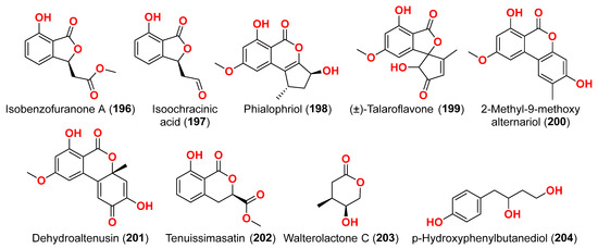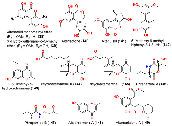 Phragamide A (146), phragamide B (147), altechromone A (148), tenuazonic acid (89), altenusin (95), alternariol (41), alternariol monomethyl ether (138), altertoxin I (52), altertoxin II (88), and alterperylenol (68) were purified from the fungus Alternaria alternata 13A, which was obtained from Thalassia hemprichii and Phragmites australis marine plants from a saline lake in the Wadi El Natrun, Egypt [44]. Only phragamide A (146) demonstrated potential antibacterial activity against Gram-positive strains. Phragamide B (147) revealed considerable effectiveness against Candida albicans, but low effect against bacterial pathogens. Tenuazonic acid (89) showed modest action against Gram-positive bacteria. Altenusin (95) and alternariol (41) exhibited comparable antibacterial efficacy against S. aureus, B. subtilis, P. aeruginosa, and C. albicans. Additionally, both alternariol monomethyl ether (138) and altertoxin I (52) demonstrated mild antibacterial effects against S. aureus and C. albicans. Altertoxin I (52), altertoxin II (88), and alterperylenol (68) displayed minimal antibacterial action towards Gram-positive bacteria. This result is due to the absence of synergism in the isolated compounds compared to the entire fungal extract [44].