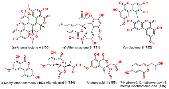 Alternarialone A (149), curvularin derivative, alternariol 4-methyl ether (150), and alternariol (41) were obtained from the crude extract of the mangrove-derived fungus Alternaria longipes, isolated from the branches of Kandelia candel at Guangxi, China [45]. Through broth microdilution assay, all compounds were assessed for their antibacterial activity against the Helicobacter pylori standard strain G27 and a clinically isolated BHKS159 strain. Alternariol 4-methyl ether and alternariol (150 and 41) exhibited antibacterial activity against H. pylori G27 with MIC values of 14.3 and 62 μM, respectively, and alternariol (41) also exhibited antibacterial activity against H. pylori BHKS159 with an MIC value of 62.0 μM, while the positive control metronidazole exhibited an MIC value of 11.6 μM. However, alternarialone A (149) demonstrated no inhibitory impact on the two H. pylori strains [45].