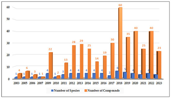 To record the data for this review, we performed a systematic literature search covering the period of 2003–2023. We queried databases including Web of Science, SciFinder, Scopus, and Google Scholar using the keywords “Alternaria”, “Marine Alternaria”, and “Marine-derived Metabolite”. A total of 208 hits, with some duplications, were found. Only manuscripts with reports about the isolation of new/novel compounds are considered in this review. Synthetic, biosynthetic, screening, and ecological studies are acknowledged where relevant but not explored in depth within this review. Also, duplicate reports and purely terrestrial studies were excluded. In total, 67 marine-derived Alternaria species and 319 compounds met our criteria. We note that our dataset may have a bias toward regions and sources that have been heavily studied (e.g., Chinese marine habitats), and some compounds (especially from less-accessible literature) could have been missed despite our efforts. We have addressed potential selection biases by cross-checking multiple sources and reviewing prior comprehensive articles on Alternaria metabolites to ensure coverage of known compounds. All structural representations assume the accuracy of assignments as reported in the original publications (we highlight where stereochemistry was later corrected or uncertain). Bioactivities were cataloged as “reported active” if the original study found a measurable activity (e.g., an IC50 or clear inhibition) in any assay; we did not impose a uniform potency cut-off, so “active” simply reflects a positive result in at least one biological test as per the source literature.