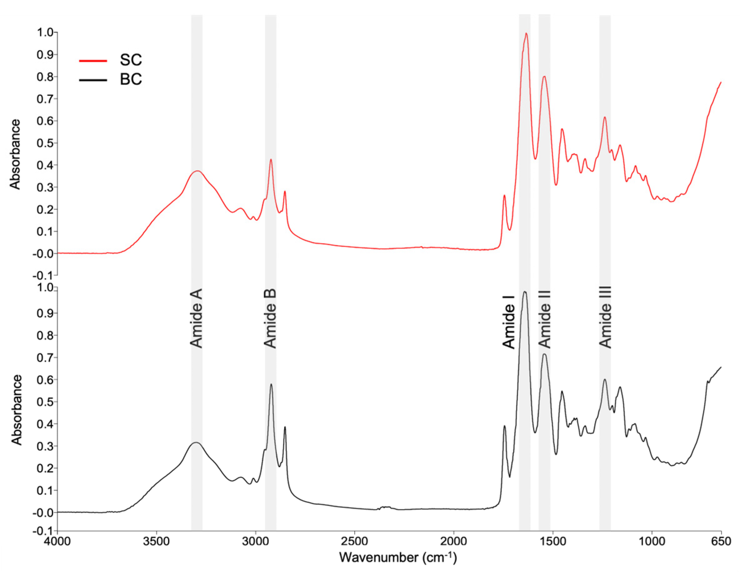 | Amide I | 1635 ± 0.60 a | 1636 ± 2.82 a | C=O stretching in peptide bond/Hydrogen bond coupled with COO- | [12,28,30] |
