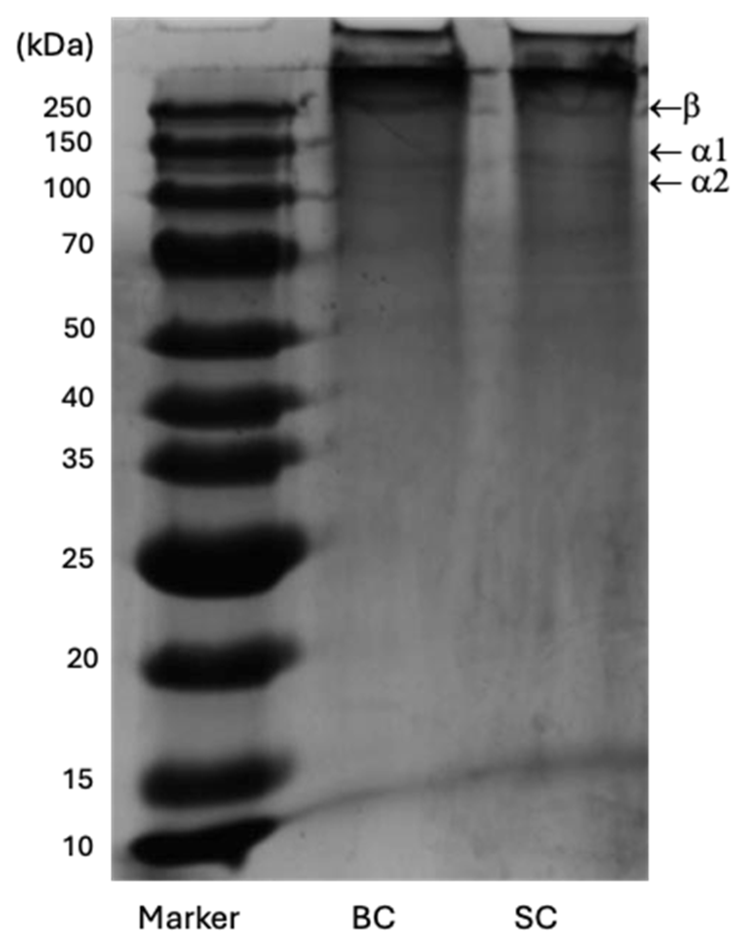 2.6.4. Sodium Dodecyl Sulfate Polyacrylamide Gel Electrophoresis (SDS-PAGE) of Collagen