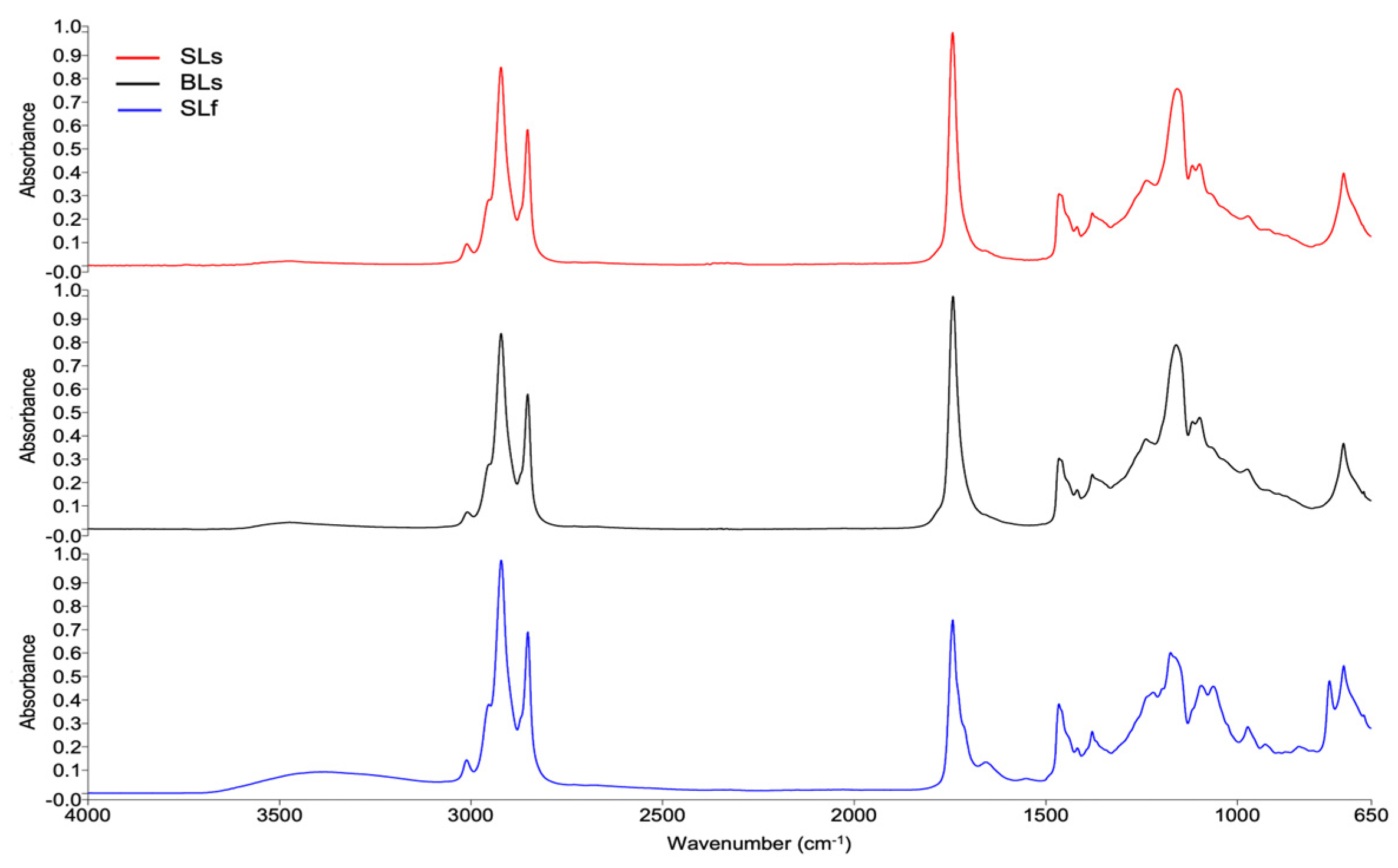 | 1742 ± 0.11 a | 1743 ± 0.02 a | 1742 ± 0.01 a | C=O stretching in triglycerides, phospholipids | [29] |