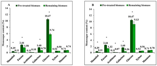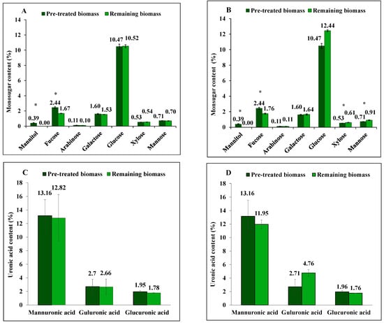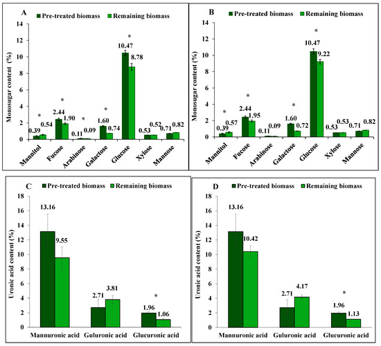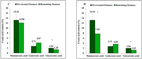The content of mannitol, neutral monosugars and uronic acids in S. latissima biomass before and after hot water extraction as pre-treated and remaining biomass, respectively, for (A,C) 30 min, and for (B,D) 60 min. Data represent the mean ± SD in percentage per dry weight (d.w.) corresponding to three experimental replicates. Asterisk (*) indicates a significant difference (p < 0.05) after extraction compared to pretreated biomass (Table 2).