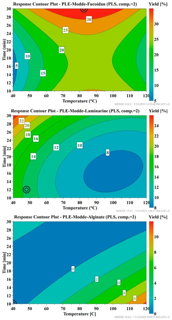 Contour plots (Figure 4), based on extraction yields, showed the optimal conditions for isolating the three polysaccharides. Moderate-to-high temperatures and longer times were optimal for enhanced fucoidan solubilization, while higher temperatures with shorter times favored alginate solubilization, and lower temperatures with extended times improved laminarin extraction.