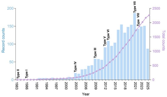 Analysis of publications on TA systems. Annual publication counts (bars) and cumulative publications (lines) from 1983 to 22 September 2025. Key years marking the identification of major TA system types are labeled.
