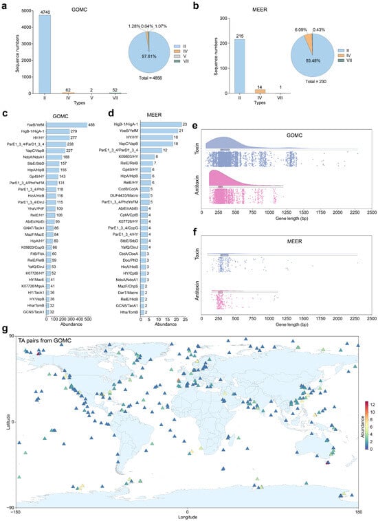Although environmental adaptation-related TA systems have been identified in several marine bacterial species [,,,,], they remain systematically underexplored. To comprehensively delineate the landscape and diversity of TA systems across marine bacterial and archaeal habitats, from surface seawater to hadal zones, we conducted TA locus predictions in MAGs sourced from the GOMC and MEER databases via TADB 3.0 []. Our analysis revealed 4856 TA systems in 2179 MAGs (2152 bacterial, 27 archaeal) of the GOMC (Figure 3a), demonstrating their pervasive distribution in marine microbiomes. The bacterial MAGs hosted 4807 systems primarily featuring biotechnologically pertinent type II TA systems (4693/4807; 97.63%), with lower occurrences of types IV (60), VII (52) and V (2), whereas the archaeal MAGs represented only 49 systems. Notably, complete TA systems (230) were concentrated in only 116 bacterial MAGs of MEER, showing a notable decrease in abundance within deep-sea prokaryotic community (230/7564 genomes) as a whole compared with shallower counterparts (4856/24,159 genomes), indicating distinct evolutionary pressures in extreme hadal environments (Figure 3b). Among the TA systems predicted in both GOMC and MEER, the top five systems were identified the same as YoeB/YefM, HigB-1/HigA-1, ParE1_3_4/ParD1_3_4, VapC/VapB, and a pair involving two hypothetical proteins (Figure 3c,d). Notably, deep-sea bacteria exclusively maintained types II (215/230; 93.48%), IV (14), and VII (1) TA systems, a streamlined repertoire potentially optimized for high-stress adaptation. The majority of toxin/antitoxin genes displayed compact 200–500 bp architectures (Figure 3e,f), which are advantageous for genetic engineering applications. To assess the potential geographical clustering of TA systems across global oceans, we mapped all characterized TA systems from the GOMC database alongside the sampling sites. Spatial analysis revealed that global mapping confirmed the nearly ubiquitous distribution of TA systems throughout marine ecosystems with no significant regional aggregation patterns observed (Figure 3g). The results underscored their dual importance: as fundamental stress–response models by extreme habitats and as untapped biotechnological reservoirs with properties such as heat stability, cryotolerance, and pressure resilience that hold promise for industrial enzyme design, antimicrobial development, and synthetic biology.