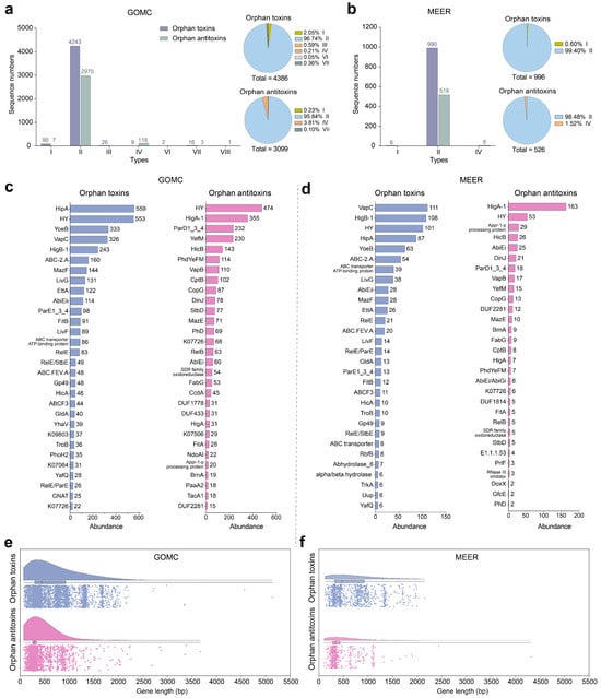 Genomic features and biogeographic distribution of orphan toxins and antitoxins. Stacked bar charts depict absolute counts of orphan toxins/antitoxins and adjacent pie charts showing type-specific proportional compositions in the GOMC (a) and MEER (b) databases. Relative abundance of the top 30 orphan toxins and antitoxins in the GOMC (c) and MEER (d) databases, where hypothetical proteins are designated “HY”. Box-and-whisker plots display gene length distributions for orphan toxins/antitoxins in the GOMC (e) and MEER (f) databases, with centerlines indicating medians and boxes spanning the 25th–75th percentiles. All orphan toxins/antitoxins are listed in Tables S5 and S6.