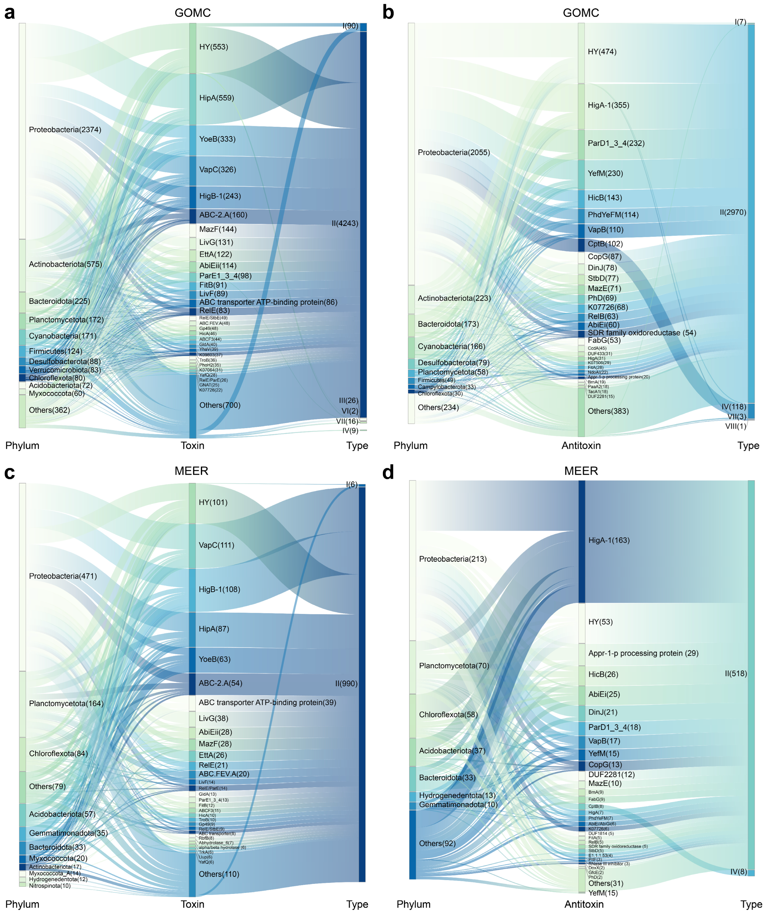 - Guan, J.; Chen, Y.; Goh, Y.-X.; Wang, M.; Tai, C.; Deng, Z.; Song, J.; Ou, H.-Y. TADB 3.0: An updated database of bacterial toxin–antitoxin loci and associated mobile genetic elements. Nucleic Acids Res. 2023, 52, D784–D790. [Google Scholar] [CrossRef]