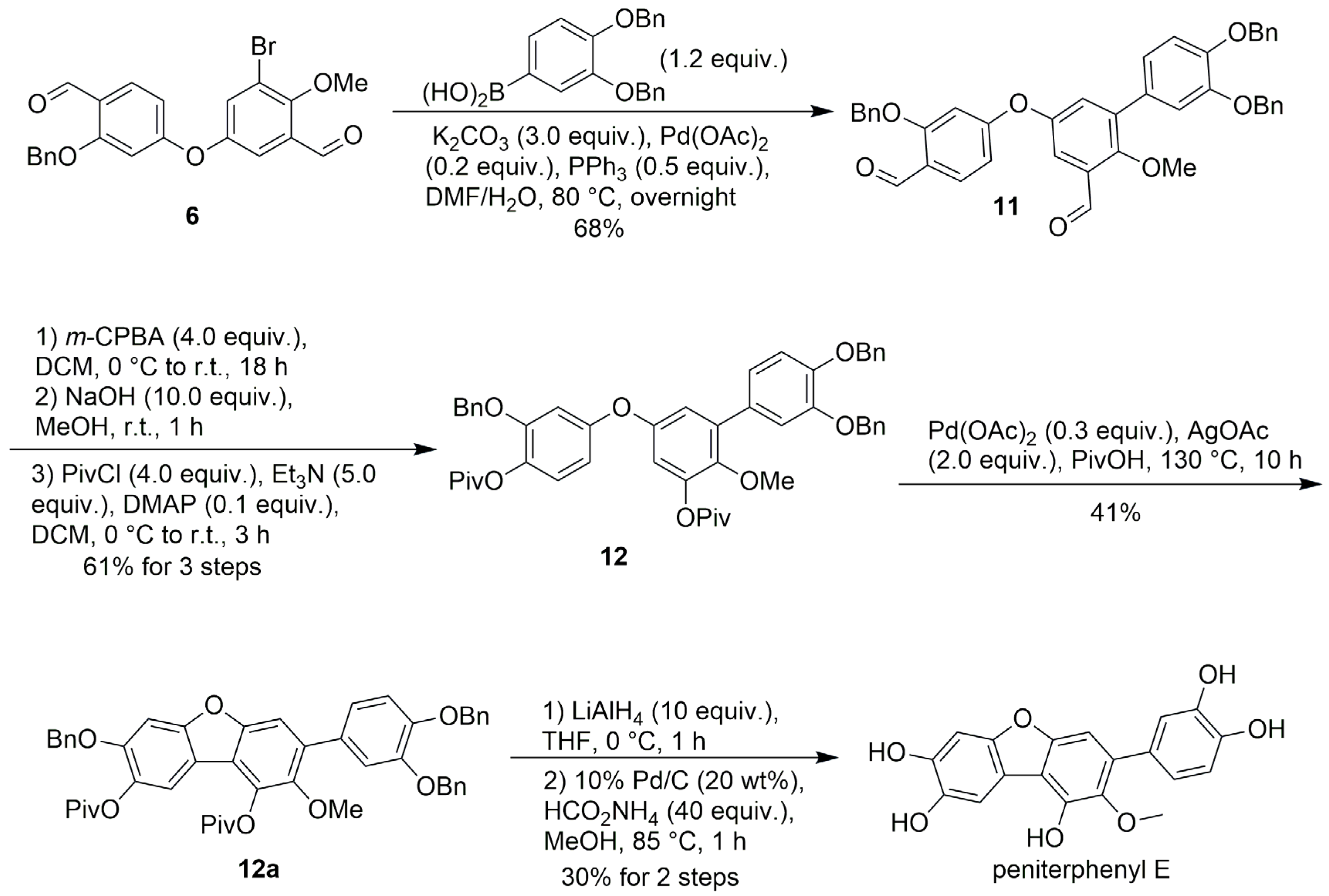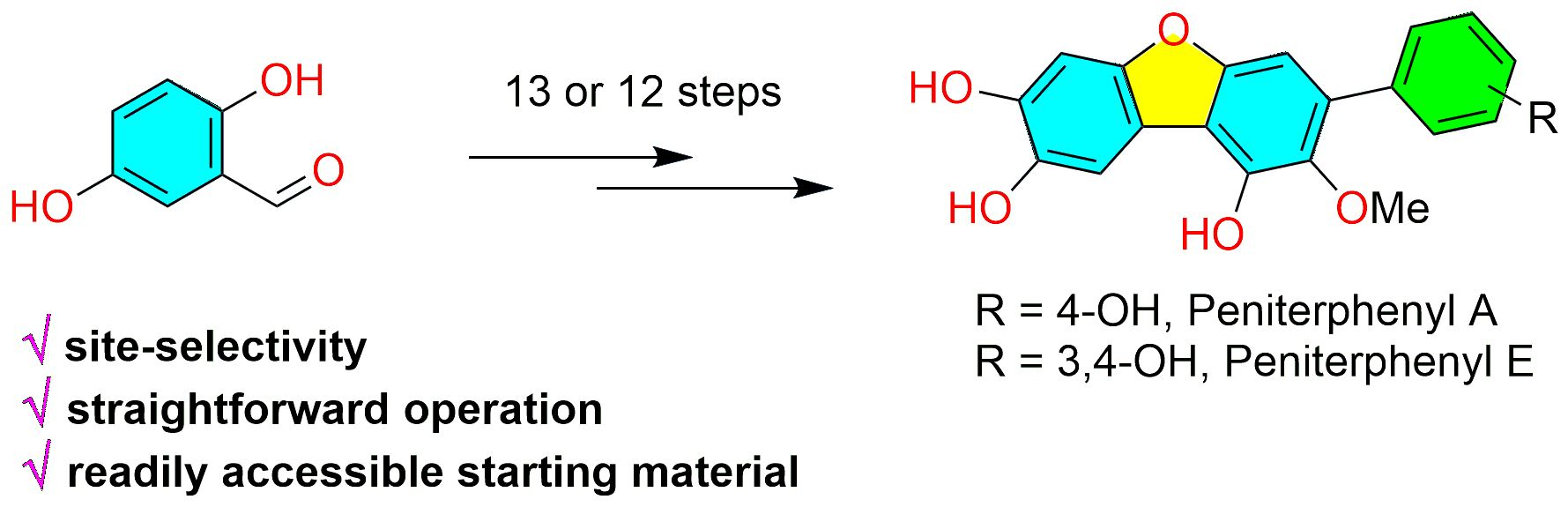 Based on these advances, we herein describe a streamlined approach to dibenzofuran assembly via a simple and operationally convenient Pd(TFA)2/AgOAc-catalyzed C(sp2)–H/C(sp2)–H oxidative coupling. This strategy enabled the first total syntheses of peniterphenyls A and E from commercially available starting materials (2,5-dihydroxybenzaldehyde and 2-(benzyloxy)-4-fluorobenzaldehyde) in thirteen and twelve steps, respectively. Key advantages of our route include (1) controlled functionalization around the dibenzofuran scaffold (C4′-arylation, C5′-O-methylation, and C6′-hydroxylation) through the synthesis of the key intermediate 4 [16]; (2) highly site-selective C1–C1′ cross coupling achieved via C(sp2)–H activation, leveraging substituent directing effects of arene ring and the steric hindrance; (3) a nucleophilic aromatic substitution (SNAr) strategy replacing the traditional Ullmann reaction for diphenyl ether formation; and (4) eliminating unique arylboronic acid precursor preparation.