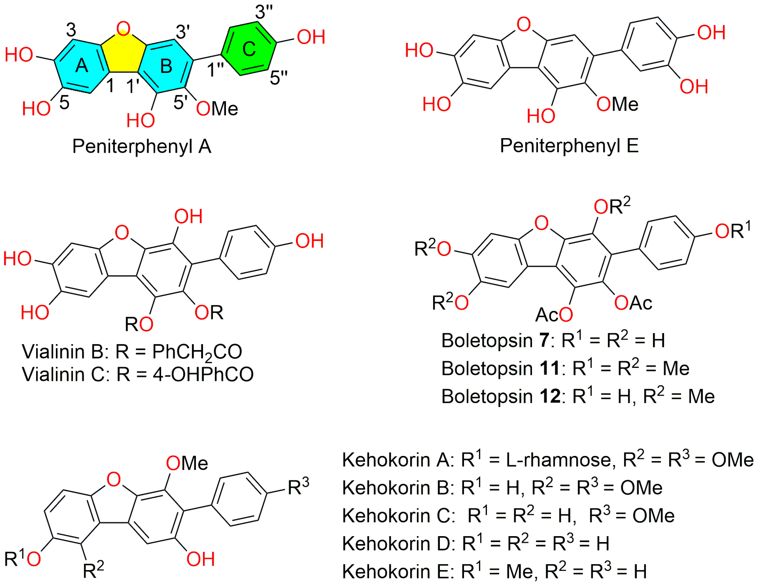 Peniterpehenyls A, E and the totally synthesized natural dibenzofuranoid p-terphenyls.